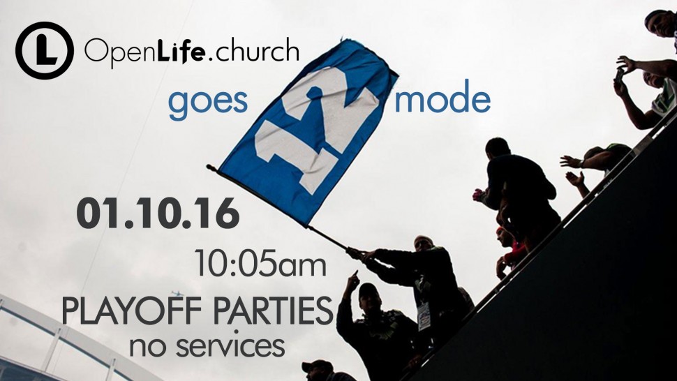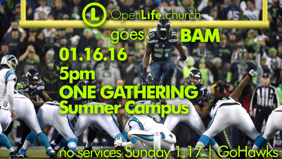 By openlife on January 11, 2016Read moreONE service, ONE location, ONE time SATURDAY 1/16/16, 5pm at Sumner Middle School You figured us out didn’t you? Now you know that we interpret a 10am playoff game for the Hawks as the most important opportunity for people to love people and it’s centered around others, food and a large screen tv. One...