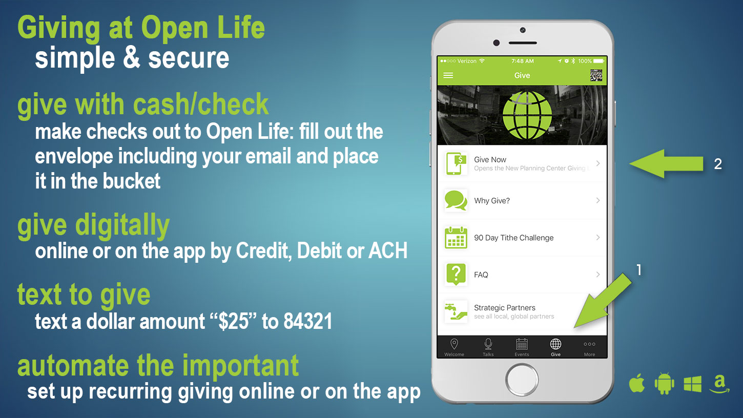 From giving to message archives you can do it all directly through the Open Life Church App on Apple, Android, Windows and Amazon devices. Download it now, select the “give” icon at the bottom and you are off and running! Want to give in a snap? Set up text giving. Simply text a dollar amount to 84321, you will first be prompted to select which church to give to (Open Life of course) and then you will set up your giving method for this platform same as you did for the Web or App platform. Once you have done this you can text an amount to 84321 and it will give automatically. Yeah…it’s that easy.