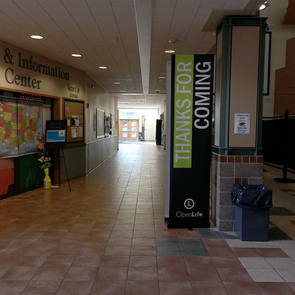 - Welcome banner on your left (which has a Thanks for coming behind it for those exiting).
