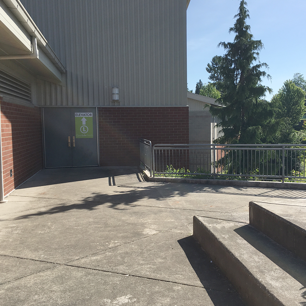 - Elevator a-board on left pointing towards double metal door entry (not pictured is a magnetic Elevator sign on the metal doors)