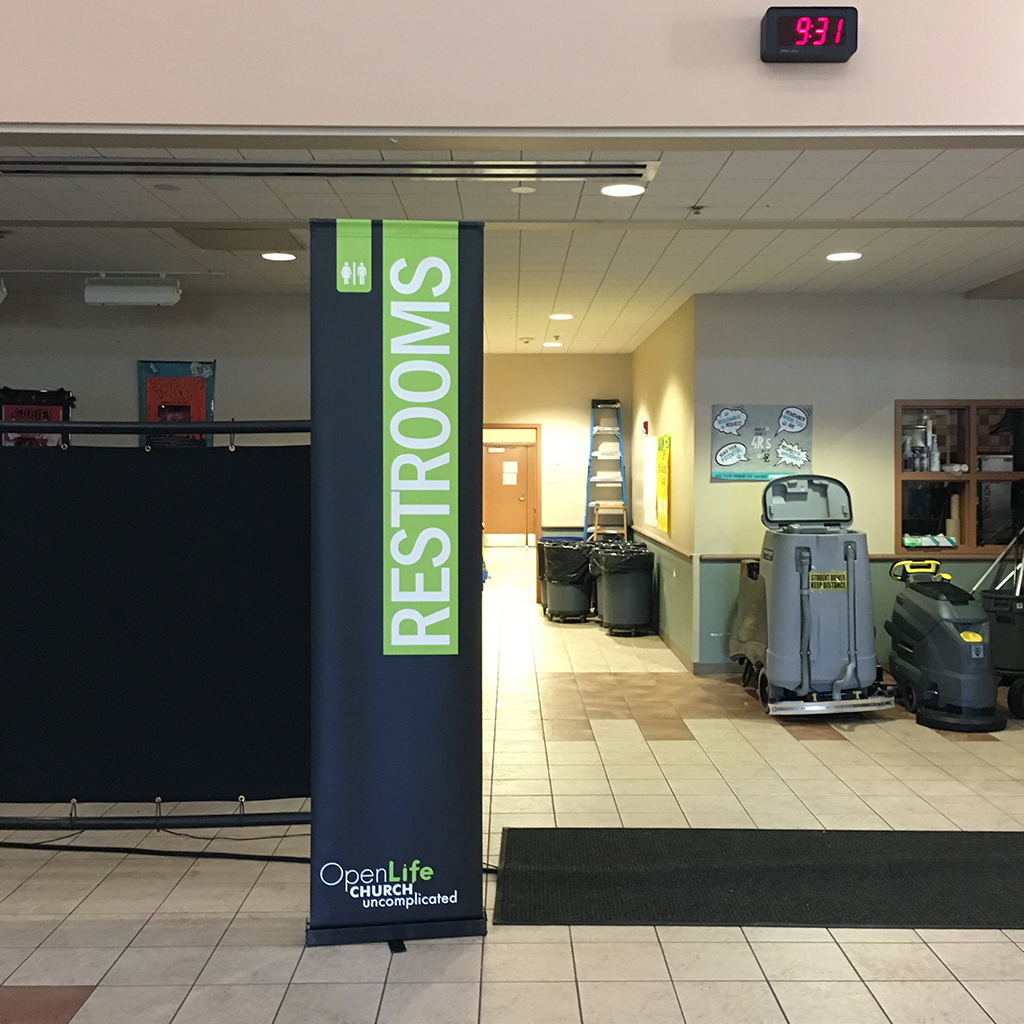 - This banner goes just in front of the final wall base and points people to the Restrooms.